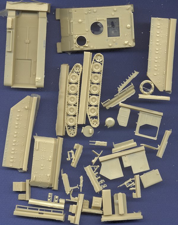 This kit was produced by converting the old ESCI (now Italeri) M113 kit. A lot of detail has been added, both to the interior and the exterior. The wheels and tracks have been greatly improved, and the extra armor looks masterfully done. The resin casting is superb, and there are only a couple of broken parts (machinegun barrels) from shipping. Although this kit is labeled "Zelda II", according the naming system the Israelis use, this is actually a Zelda I. The Zelda II uses new and improved Blazer stand-off armor. The instructions are adequate, but no markings are included. This is an excellent model, and will look really great when built. Thank you to Michael Hatch for providing this review kit. |