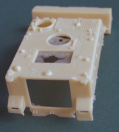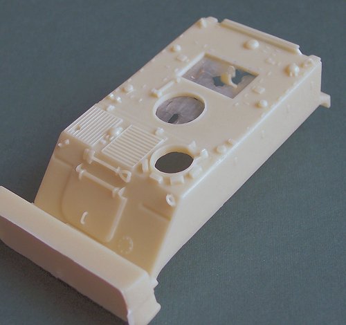 The parts are up to Modell Trans' high molding and casting standards, with very few blemishes or air bubbles. The most obvious flaws are a couple of sinkmarks in some of the interior parts, copied from the originals. The hull and chassis are heavily modified and improved from the ESCI parts. All hatches are open, and the interior is detailed, except for the engine compartment. The wheels have been greatly improved, with accurate pairs of wheels, and guide teeth on the tracks. The .50cal MG is fantastic, as are the 7.76mm FN MGs (I think that's what they are).