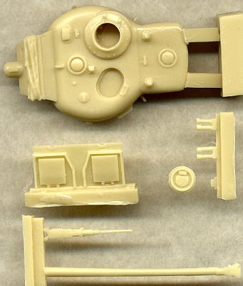 The set includes a complete turret with appropriate modifications; the main gun (slightly warped, but should be easy to fix); .50cal machinegun (improved somewhat from the ESCI gun); and a new engine deck. A commander's hatch is included for the cupola, but the loader's hatch is required from the doner kit. Smoke genade launchers are also included. As typical of this company, the resin is very high quality, with only very minor flash, and the only air bubble I've found is on the very tip of the muzzle brake. Although specifically designed for the M4A1 kit, I'm fairly certain that this turret could also be used on an M4A3, as well as other Sherman variants, such as M4A2 or M4A4 (only available from MR Models at this time). Note that ModellTrans also has released two complete kits of the M50, the M50 HVSS (Israeli), and M50 HVSS (Chile). |