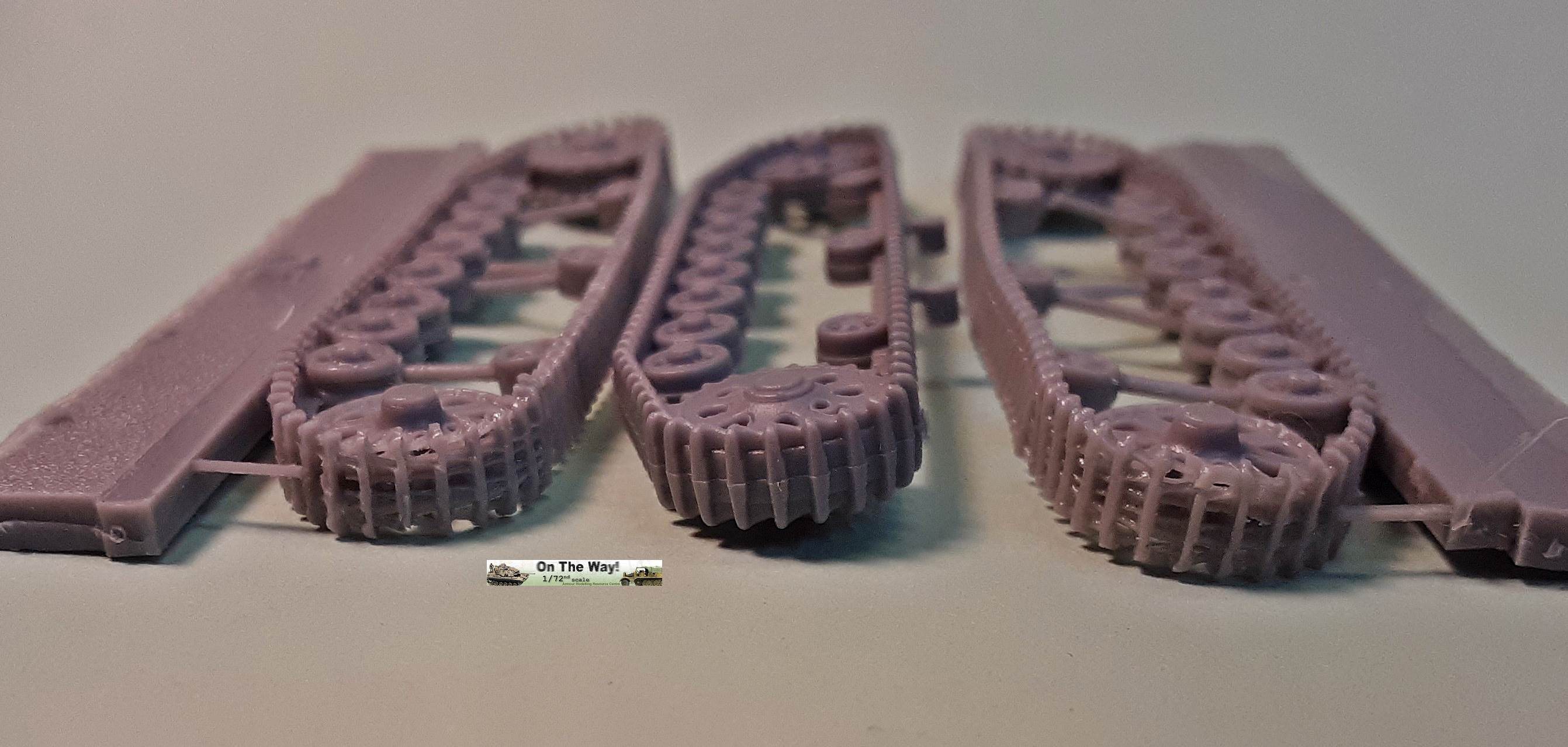 in 1/72 scale. [FTF is a sister company of IBG models from Poland.] The StuG 0-Series were pre-production Sturmgeschütz assault guns made from soft steel so not suitable for combat, only training. The suspension was based on the Panzer III Ausf. B. I understand that the Pz III Ausf. B did see combat use in Poland but only about eight were produced. No StuG 0-Series were used in combat. The set consists of two cast resin, one-piece combination track and wheels, packed into a clear plastic box, that should pop right onto the kit hull, after cleaning off the pour plug.