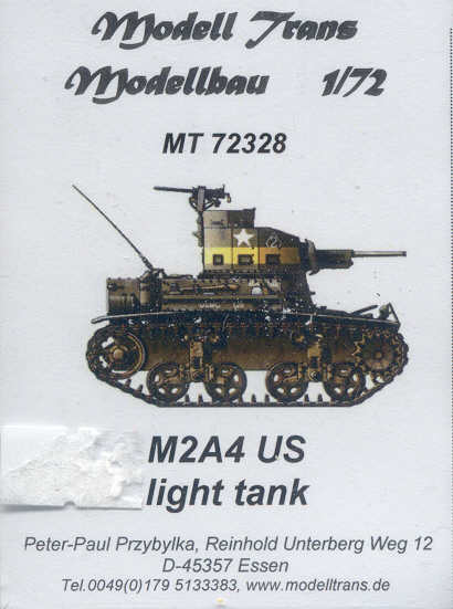 This is a review of an American light tank developed in the late 1930s and is the precursor to the M3 and M5 Light Tank series. It served mainly as a training tank for the US Army and did see combat on Guadalcanal in 1942. Several M2A4 tanks were also used by the British for training. For those modelers making a collection of M3 light tanks you should have this model. The model comes in a clear plastic box with artwork showing the vehicle profile and some markings of a yellow stripe around the turret and star and a unit marking. The lineage with the M3 Light is obvious and with notable differences in the M2A4 having seven small view ports (pistol ports) around the turret and a different idler wheel. The turret is similar to the octagonal, riveted turret of the initial product M3 though the 37-mm gun barrel has a different recoil mechanism and construction. The