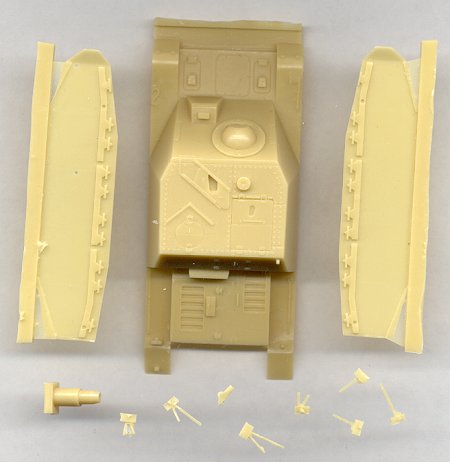 This conversion set is designed for the Hasegawa Pz IV. It was made by grafting the upper hull casement of the ESCI Brummbar kit onto the upper hull of a Hasegawa Pz IV kit. By doing this, accurate fit to the rest of the Hasegawa kit parts is assured. The detail is very nice, thanks to the good detail on the original kits. Unfortunately, this does not eliminate the major weaknesses of the Hasegawa Pz IV kits, those being the awful tracks, and the smooth fenders. The set contains the new hull, armored side skirts (also copied from the ESCI Brummbar kit), the main gun, and several small pieces, which I assume are mounting brackets. No instructions or decals are included. I do not know if this set will fit the lower hull of the Revell Pz IV, but it would be nice if it did. |