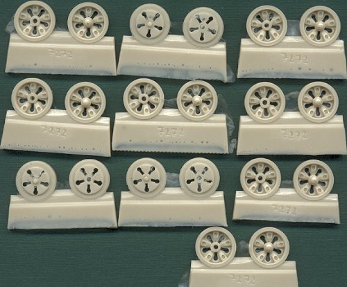 A complete set of wheels for one tank. Appropriate for T-34/85M, T-54 or T-55. Very highly detailed, and mostly well cast, except for several bubbles in the hubs. The holes in the raised spokes are a little large, but I have seen photos of different styles of these wheels, some with large holes, others with very small holes. This is a very nice set, and I need to get a couple more of them.