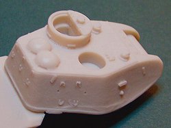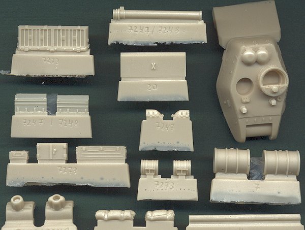 Most of the parts are cast in resin, although a few are also provided in cast metal. The turret is the main piece, and it looks great. Although I need to confirm it with my references, I think that it has been correctly modified for this version. Two gun mantles are included, though the instructions have you using only the one on the right. The resin is extemely high quality, with only a couple of very small air bubbles, and a slight mold shift on the left side of the turret. All in all, this model has the best resin casting I have yet seen in an MR Models kit.