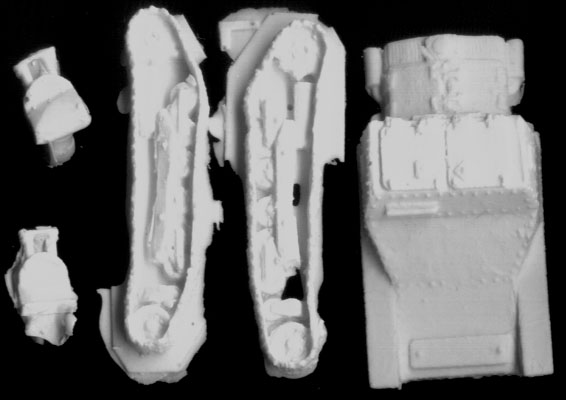 This is obviously a quite simple kit with only the five parts shown above. I think that this is an example of good master models being hampered by poor molding techniques. The detail on the parts, especially the main hull, appears to be pretty good. But the poor quality of the resin and the molding detracts from the final product. The two parts on the left are machinegun turrets, one of which I believe attaches to the left front hull. I think that the other one is a spare. It's hard to know without any reference material, for no instructions are included with this kit, nor are any decals. There is a poor color photocopy of the completed model on the box cover, but it is so small and of such poor quality that it is almost worthless. I would recommend this kit to experienced modelers only, or to wargamers who need a cheap and sturdy CV3.
