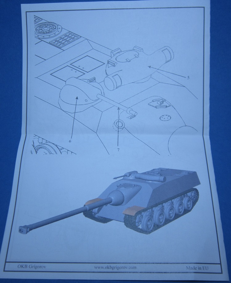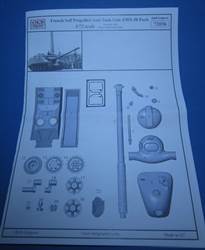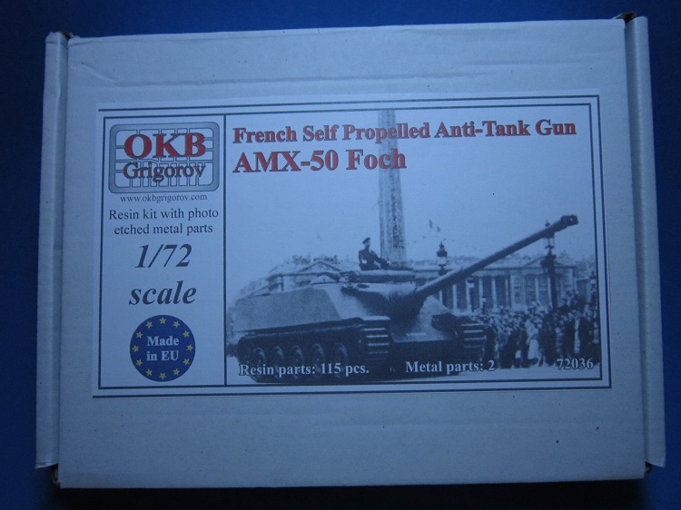 | History, Taken from Wikipedia... Based on the M4 chassis in 1950 a prototype was finished of a heavy tank destroyer in the form of a 120 mm self-propelled gun, the Canon Automoteur AMX 50 Foch, named after Marshal Ferdinand Foch. It was intended to give long range fire support to the medium AMX 50 "100 mm"; after the tank version itself was planned to be armed with a 120 mm gun, the Foch project was abandoned. This is a very popular tank for the World of Tanks game apparently. The model is quite straightforward and has some very nicely cast parts. There is very little flash and what there is can be easily removed with an old toothbrush, the casting blocks are easy to remove and clean up is very easy. What do you get? The box is the standard OKB-Grigorov white box with a printed label on the top... Inside the box... The instruction sheet... The hull castings... These are the main castings in the kit... The pieces fit together absolutely precisely... The bits bag emptied... The running gear, first the torsion bar arms...