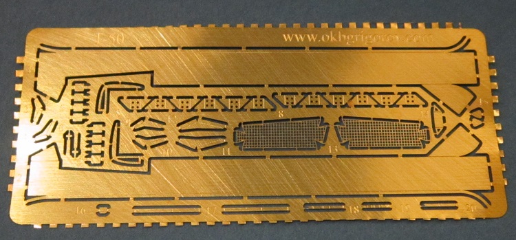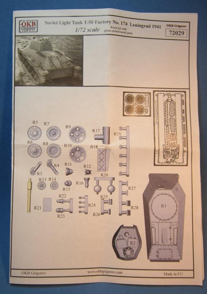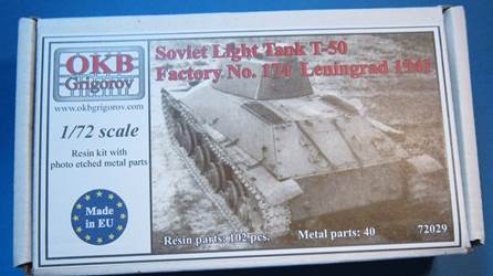 | This is a review of OKB-Grigorov's 'Soviet Light Tank T-50 Factory No.174 Leningrad'. The model comes in the usual white cardboard box with a photo of the tank on the lid... Inside the box there is: the instruction sheet, two zip-loc bags (one with the tracks and turned barrel and one with the various resin parts required for the model), the hull, the turret and two more zip-loc bags with both the photo-etch frets. The quality of the castings is excellent and they are virtually flash free, the photo-etch is well done and very fine. The Instruction