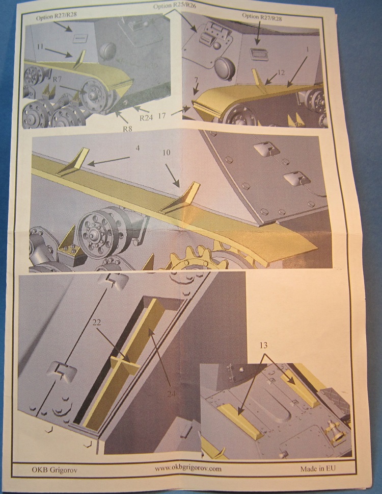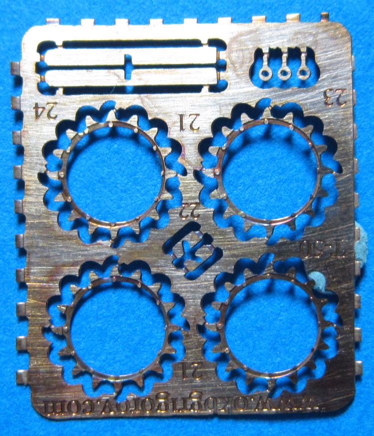 sequence of the build, these are clear and unambiguous ... The Hull is extremely well cast with only a small line of flash from the casting block, which has been already removed... The Turret is also extremely well cast and the only flash to remove is on the bottom of the turret plug... The photo-etch is on two frets, one is very fine brass and has all the detail parts for the hull and turret, the other is of a copper compound and has the sprocket teeth and a few detail parts. Both frets are well laid out and are extremely well detailed...