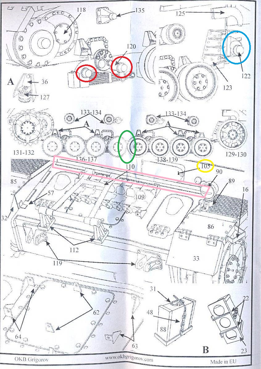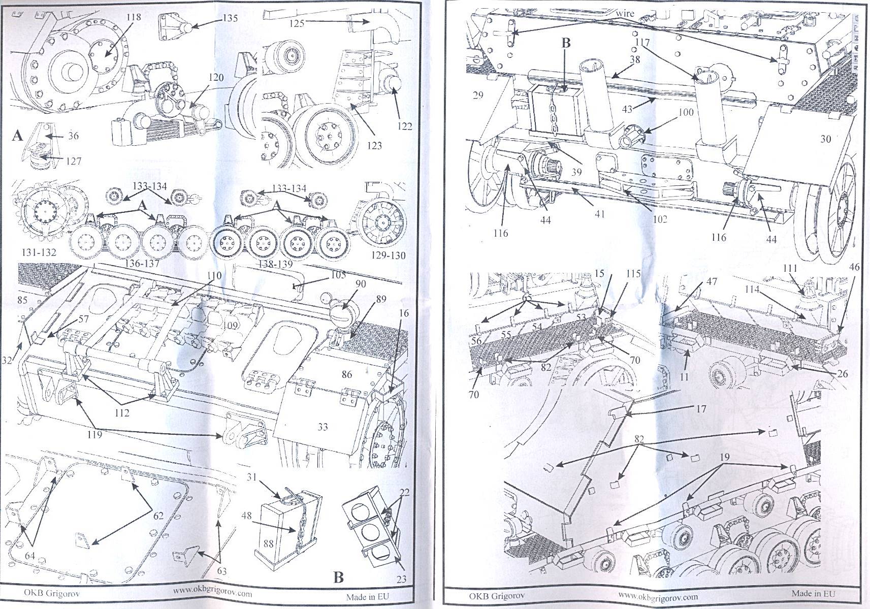 Only after I started construction did I notice that the "pipes" on which the Thoma Schürzen are suspended (parts 87) were missing from my specimen. The instructions are elaborate, but at first sight don’t follow any logic. I didn’t find any instructions to glue the upper and lower hull together, for instance; the drawings are mostly meant to show where which part goes on the assembled kit. However, the parts need to be identified by number first, based on drawings on the instructions (they are not repeated on sprues as on classical, injection molded kits). Knowing that the parts are plentiful (I’ve been told more than 450, and I don’t dare to try and get a more precise count), this will be somewhat of a challenge unless you are very familiar with German armor and can thus identify parts on sight.
