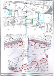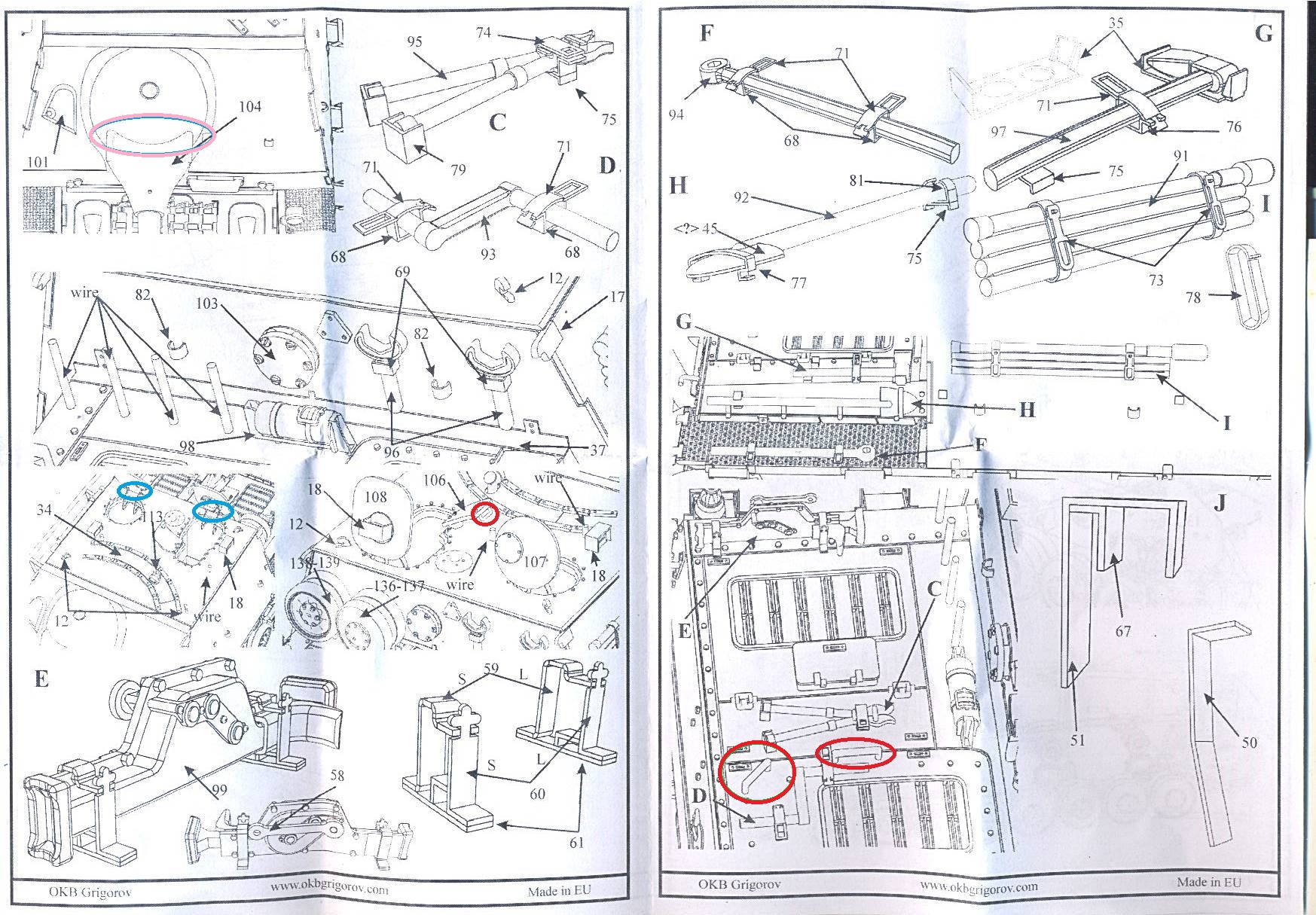 Actual construction started by mating the upper and lower hull, adding bits and pieces along the way, starting with those that were the least likely to break off during handling of the kit. The reinforcement strips that hold the different major assemblies of the (real) vehicle together are provided in PE. As they are long and slender, and as I don't have a bending tool, folding and installing them was a challenge, as any deviation from a straight line will show. Corrections were made with thick paint. Some notes about the parts on the first page of the instructions (above):