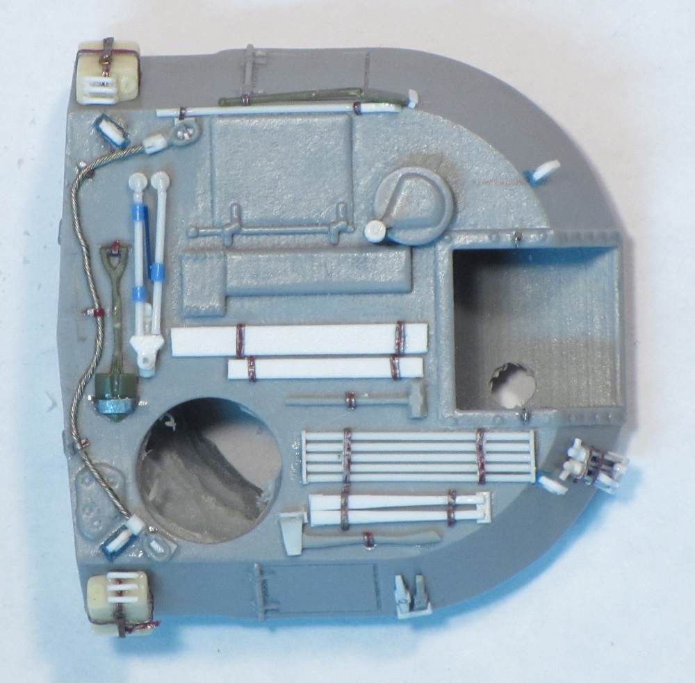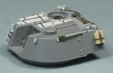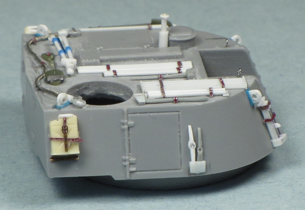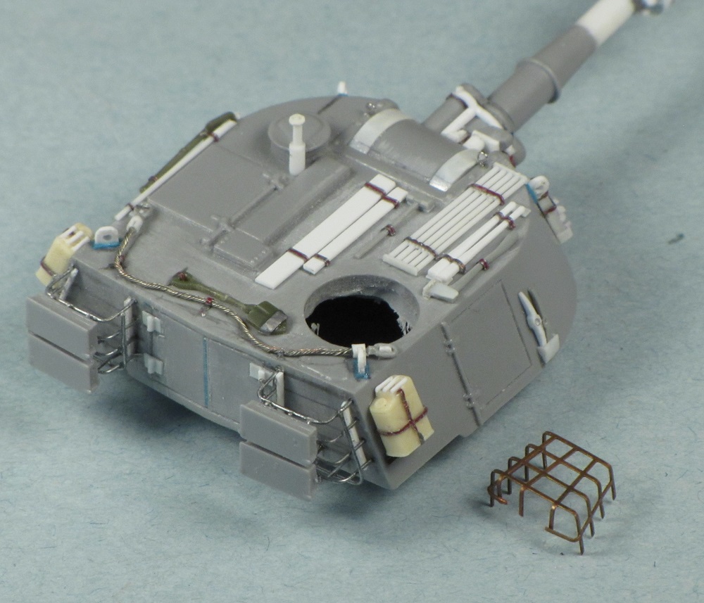 The stowage racks at the rear of the turret are provided as thick photo-etched parts. I folded one of the baskets to shape, and it looked OK, but it