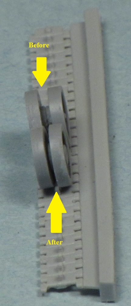 I used the same process on the idlers to reduce the gap. I had to drill out the holes in the back of the idlers to fit the axles moulded to the hull. Similarly, I