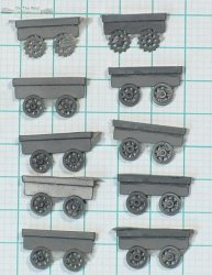 The eight paired roadwheels and two sprockets are crisply cast. The sprockets have 8 spokes and 13 teeth - they should have 15 teeth, though the difference is