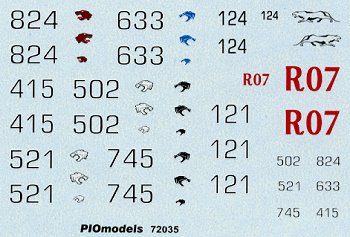These decals appear to be printed by the same folks who do the Techmod decals, and they look great. Nice and thin, good opacity, and printed in register. There are markings included for an amazing nine different vehicles, although there are no crosses provided, so those will need to be obtained elsewhere. All in all, I am very impressed with this kit. It is a simple conversion, but with the inclusion of the Eureka tow cables and the excellent decal sheet, it makes it quite worthwhile. Perhaps for future releases, PIO Models could consider adding smoke grenade launchers. If they feel really energetic, they could also provide a new turret that corrects all the deficiencies in the Revell Ausf. D turret (and while we're dreaming, how about some new wheels with only 16 rim bolts?). Thank you very much to PIO Models for the providing the review item. |