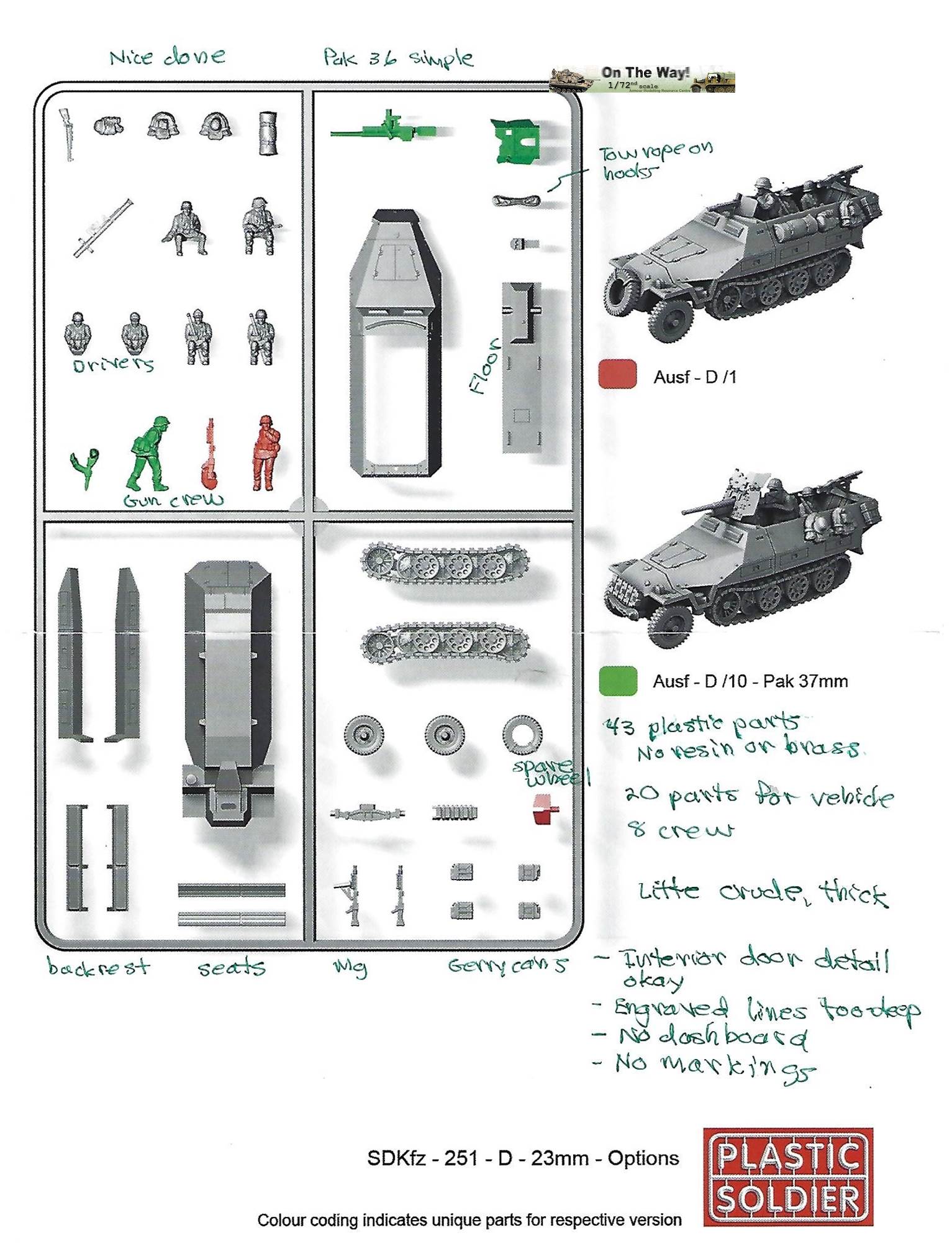 References and helpful links SdKfz 251 In Action, Charles Kliment & Don Greer, Squadron Signal Publications Armor series No. 21 (1981). THE Sd.Kfz 251 HALF-TRACK by Bruce Culver, Osprey Vanguard 32 (1983) [Replaced by the newer book Sd.Kfz 251 Half-Track 1939–45 (New Vanguard Book 25)] Henk of Holland modeling website, section on Plastic Soldier Company model kits.