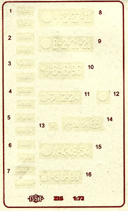 The decals in the kit are common to all of PST's Zis kits. The scan below is of very poor quality, in order to show the white markings; the actual decals themselves look quite adequate, and typically, PST's decals are very high quality.
