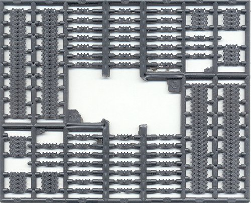 The above sprue shows most of the miscellaneous details that come with each and every KV kit. It includes spare fuel cannisters, fender stowage bins, tow hooks and rings, the end-loops for the tow cables (which need to be manufactured by the modeler), as well as numerous smaller details.
