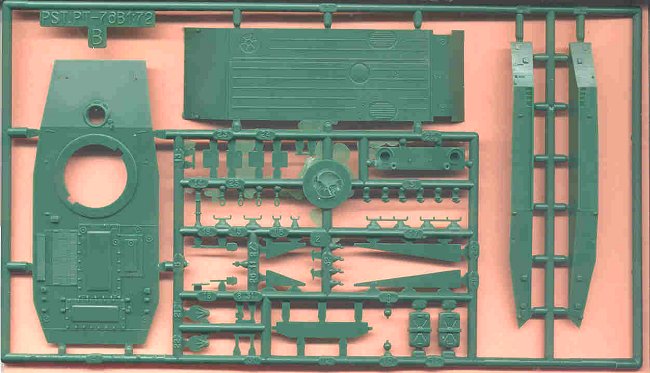 Parts are finely and delicately cast. Assembly of the hull requires gluing the top, the two sides and bottom together. Thin flash is on a number of small parts though clean-up does not appear difficult. Unlike the PST T-55 model, the torsion-bar suspension arms are not separate but are molded onto the hull sides (typical of most small scale models).