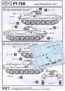 Light amphibious tank, developed and produced in the 1950s. The PT-76B variant was produced 1963 to 1968. Over 12,000 were produced and used by many Warsaw Pact nations, North Vietnam, Egypt (in 1973 War), by Israel (captured) and by other nations. Well armed with a 76-mm cannon it was lightly armored and large so as to allow it to retain its amphibious feature. This PT-76B variant differs from earlier versions by its double-baffle muzzle break, fume evacuator and double-axis gun stabilization.