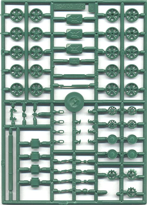 The T-55 sprue (pictured below) is mostly the same as the T-54 sprue, but comes with different wheels: the starfish pattern, which was common on T-62 as well, so these could be used in place of the horrible wheels on the ESCI T-62 kit. The wheels (on both of these PST kits) are very well done. While the starfish wheels are better than the wheels in the early ACE kits (such as the one I built), I have seen scans of the "new" ACE wheels included with later releases of the ACE T-55, and they appear to be about equal. But the chassis on this PST kit looks like it will be much easier to assemble than the ACE kit.