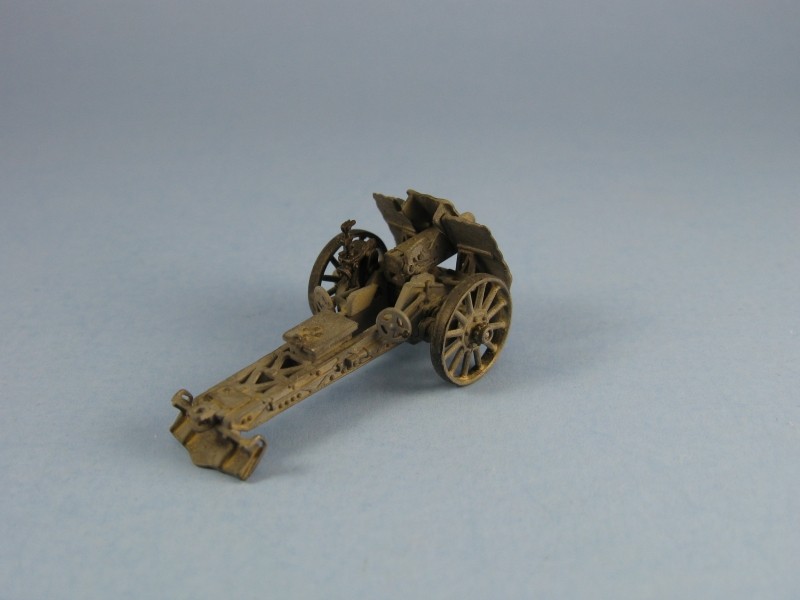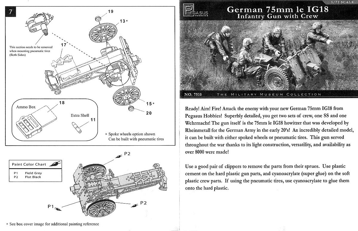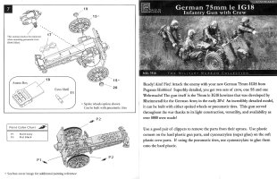I won’t go into a lot of detail on the history behind this gun. Suffice it to say, the 75mm leIG18 was introduced into the German Army in the early 1930s as a close support weapon for infantry units and was used throughout World War Two. The kit’s parts come on two sprues. One sprue holds 32 parts for the gun molded in hard plastic. The other sprue is of soft plastic containing the figures (8 gun crew in total) plus their kit and weapons. On this sprue there are also three gun related parts for two optional wheels plus an open ammo case exposing 3 rounds. The modeller has the option of two wheel styles: steel rimmed spoked wheels intended for horse drawn transport (hard plastic) or pneumatic tire wheels for motor vehicle transport (soft plastic). My review will only concern itself with the gun. Instructions are simple and easy to follow and you can pretty much follow their steps as laid out. Gun parts are molded very well with nary a seam or sink mark to be found. It’s unfortunate that Pegasus decided to put the extra wheels on the soft plastic sprue. Construction is straight forward. I chose the spoked wheels option, assigning the pneumatic wheels to the spares box. I only made two simple modifications to the kit. First was some thinning of the shield edges with some judicious scraping with a hobby knife followed with some sanding to smooth everything. The other was to drill out the barrel opening to deepen it and make it look more realistic. I found it easier to build the gun in four separate assemblies - carriage, wheels and barrel. I left the small traverse and elevation wheels off (added in steps 2 & 3), as well as the sights (added in step 3), until the end to prevent them from being broken or lost during painting. The instructions provide overall gray as the sole painting option, which is the one I chose for an early war horse drawn weapon. I suppose it would be equally valid to paint the gun later war yellow, or even yellow with brown and green patches, especially if the modeler chooses the pneumatic tire option. As for the figures, they look quite nice to my untrained eye, though they are molded in soft plastic and do show some very fine seam lines. For a review of the figures I suggest that the reader visit the Plastic Soldier Review site. There are no instructions for painting the figures, so it is left to the modeller to find the colours for these for himself, or use the box top artwork as a guide. A nice little kit overall. Fit is great. Molding is great. Modifications required are few. Addendum by Al Magnus (14/October/2016) References: Review sample purchased by the author. |