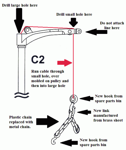 end of the crane's arm, as shown in the instructions, but instead passes through a hole in the arm just in front of another pulley. I did not use the thread provided for the hoist. I've always found thread to be too furry for use as cable. Instead I used some braided fishing line.