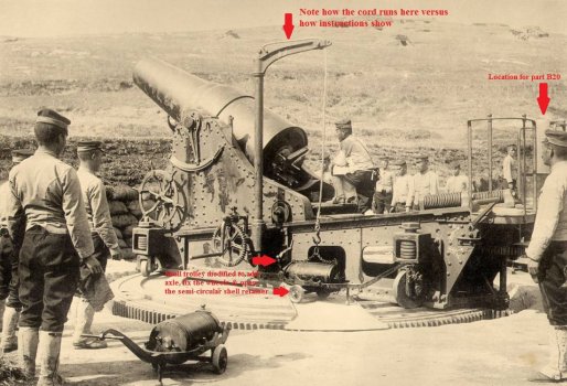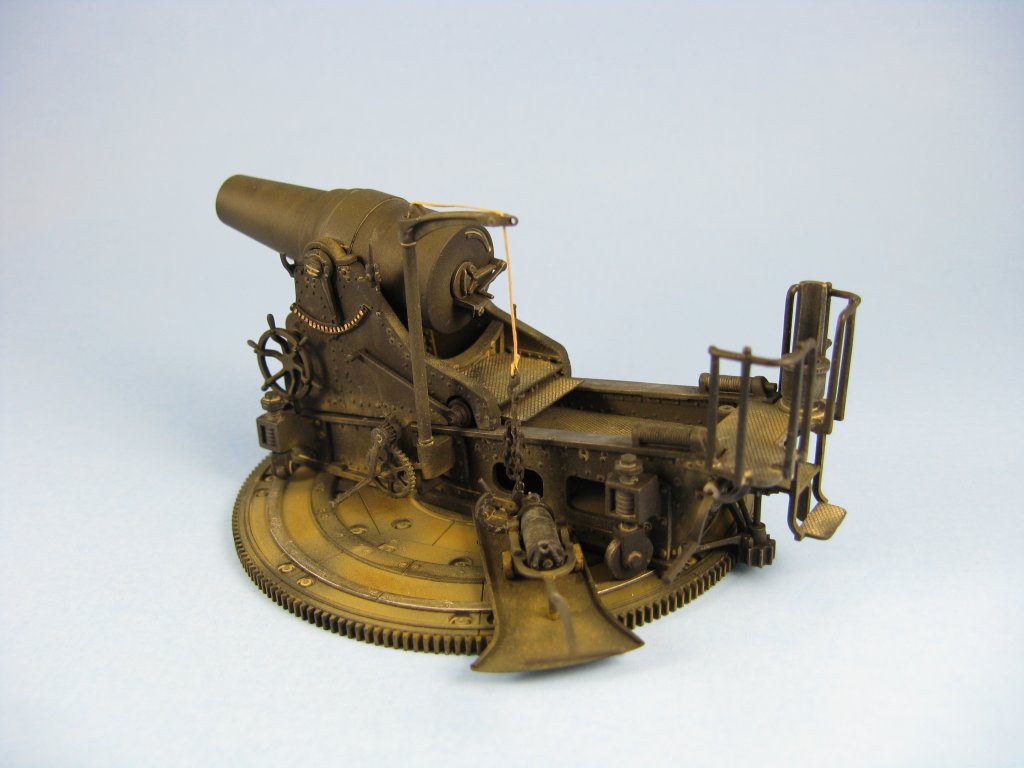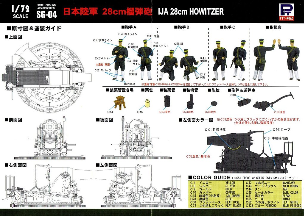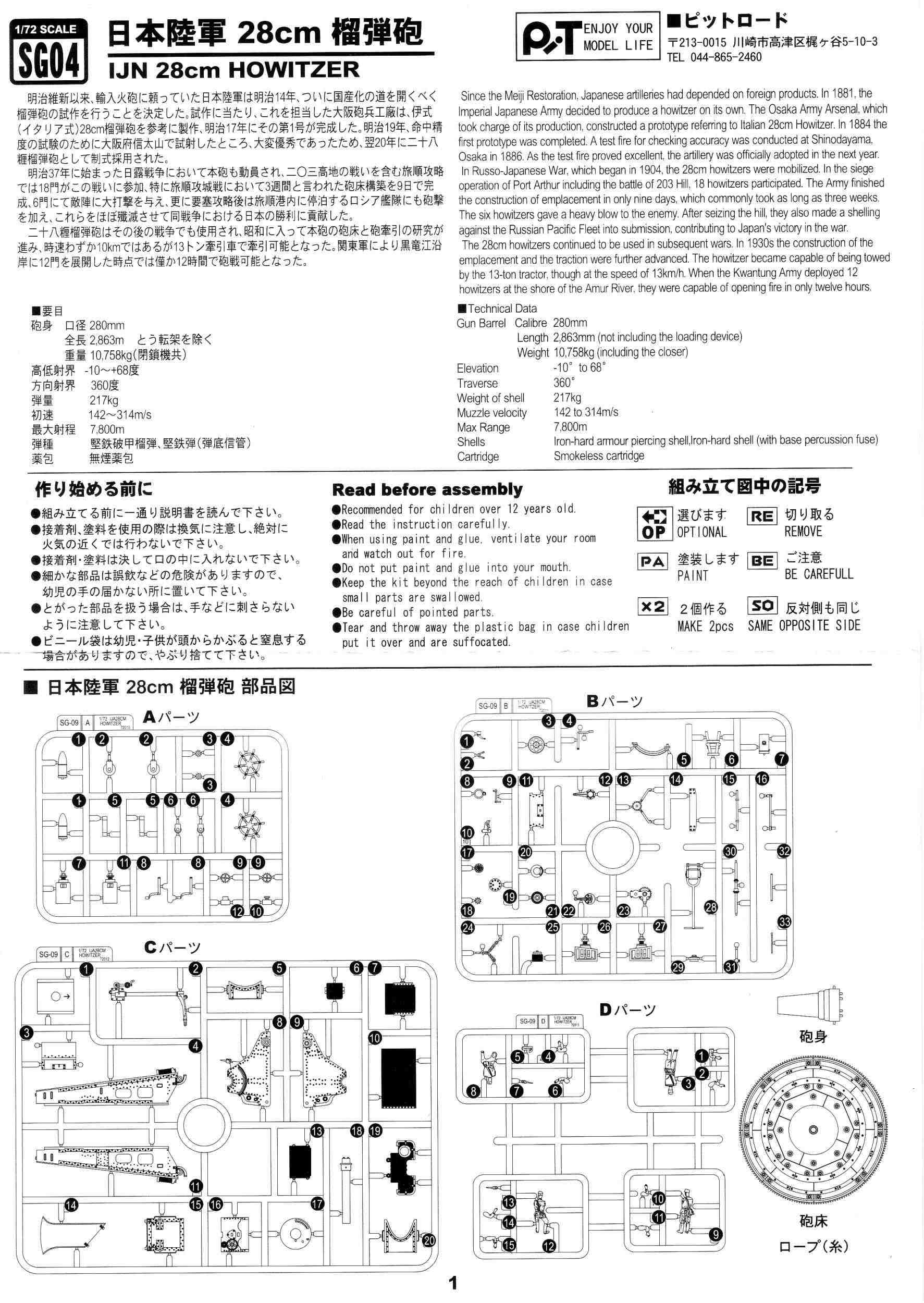 History The 28cm (11 inch) IJA howitzer was built by the Osaka Army Arsenal, patterned on an Italian gun designed for them by the British. The gun was officially adopted for production in 1887. It was used against Russia during the Russo-Japanese War just after the turn of the 20th century. In late 1904, six of the guns were used in the capture of Hill 203, and then employed in the siege of Port Arthur in Manchuria. Over the course of the next few months the howitzers were used to devastating effect on the Port itself, as well as sinking four battleships, a pair of cruisers, and damaging one more battleship, and in early 1905 the Russians surrendered after most of their Pacific Fleet had been destroyed. The guns were also used again during World War One. At this time Russia and Japan were allied against Germany, and Japan provided some howitzers to Tsarist Russia, some of which were captured by the Germans during the course of the war. During the 1930s the guns were modified for towing by a 13-ton tractor, and subsequently used again against Russian forces at the Amur River in what was to be the beginning of the Khalkhin Gol/Nomonhan War. The howitzers also appear to have been in place as coastal defence around Tokyo Bay and Western Japan during World War Two. The kit The build Construction was straight forward, requiring few deviations from the build sequence. The modular design of the real gun as well
