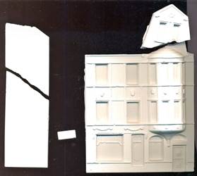 | This is a simple set consisting of 3 plaster parts. Mine actually consisted of 5 parts as both big ones were broken, even though the set came in bubble wrap and a sturdy cardboard box. You get 2 wall sections with rather nice outside detail and a small brick-like part that will serve as a step for the middle door. (Thanks to Tomáš Jakl for pointing that out to me.) Sadly, there is no detail on the inside (as is often the case with this kind of set), nor are the windows open. This means architectural scratchbuilders have their work cut out for them. Sample kit bought by author a long time ago. |