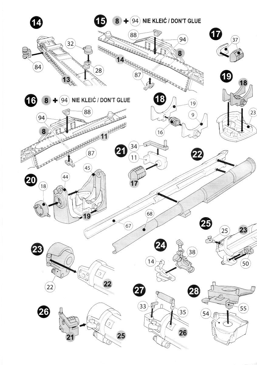 gun is in transport mode, so some care is also needed here to glue them in the proper location. In Step 8 the holes in the trail pads should be refined with a drill bit.