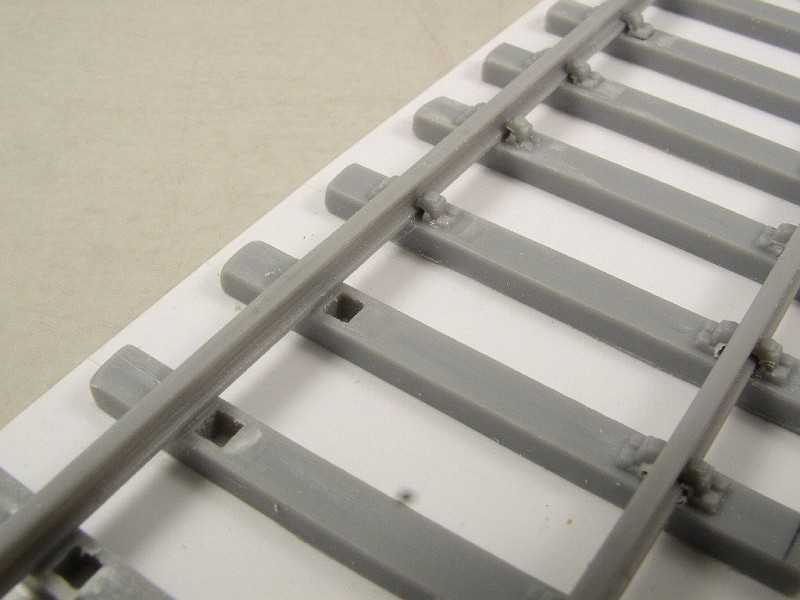 To hold the rail assembly as it is adjusted and assembled, I glued the ties to a piece of white plastic…say 40 thousandths thick. The ties were spaced equal distance apart and aligned based on the remaining plates. One rail was slid through the plate openings taking great care not to push but to pull it. Make sure the rail is straight! Then, measure the distance needed to fit the car's gauge, between the wheels. Transfer this measurement to the ties and glue plates for the second rail using that mark for location, but skip every other tie and only on the inside of the rail. Fit the rail against those plates. Place the model on the rails. If it doesn't fit…use a stiff metal ruler laid against the plates to push them in or out until the car does fit. Then glue the rail in place and the rest of the plates to their ties, setting the model on the rail periodically to make sure it still "fits". (See the picture, those square openings used to be under the rail!) Finally, trim the edges of the tie to be equal on each side. Whew…the track assembly took much longer than the car!!!!!