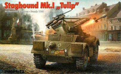 | "Tulip" was the name British troops gave to AFV equipped with 60 lb rocket projectiles (the same as used by RAF Typhoon squadrons). Sherman and Cromwell Tulips are well-known, Staghound Tulips more or less unknown. More about that later. As Al Magnus has already written an extensive construction review of the very similar Staghound Mk II, I'll limit myself to the kit-specific items. The sprue