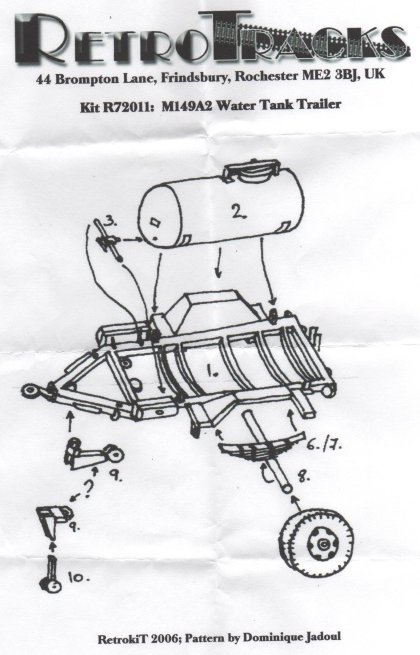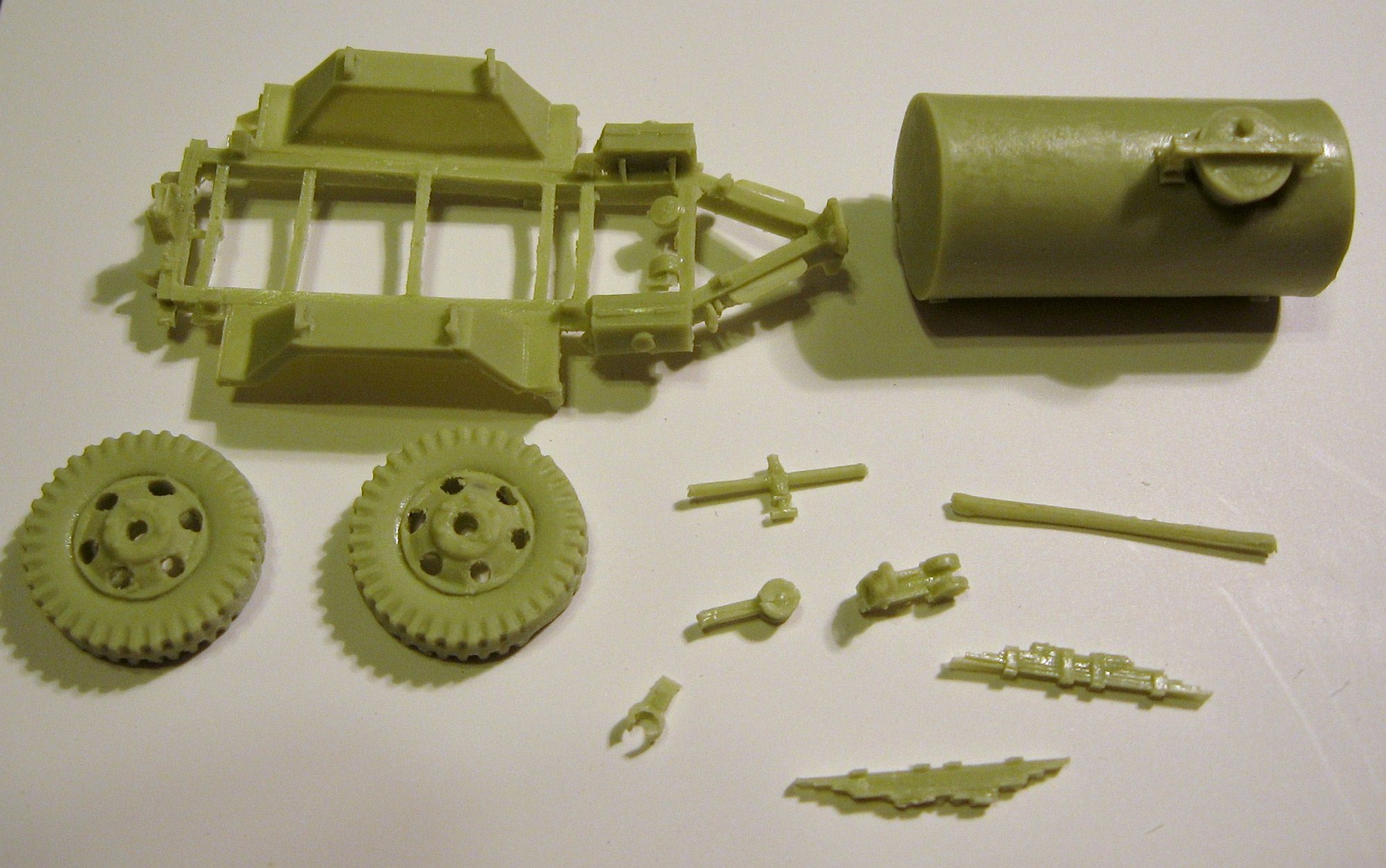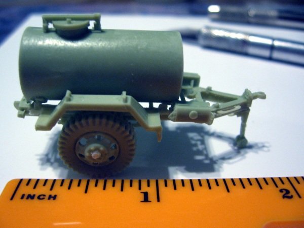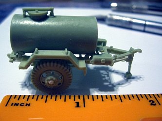 This RetroTracks kit is molded in a light pea green resin and consists of 11 parts. There is an option to have the trailer's 3rd wheel modeled in the up position for towing, or down in a resting or parked posistion. There is a small amount of flash on the parts. I also found the trailer's frame to be warped and the tank to have a less than perfect shape. The axle for the wheels was warped and out of round so it was replaced with a piece of plastic rod. I'll probably add some safety chain to the towing eye to give it some additional detail. When assembled, the trailer is less than 2 inches in length. While searching for pictures on the web of this kit, I found the photo on the box-top right away. It's from a Army Reserve center in Dallas Texas, circa 2005.