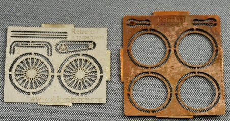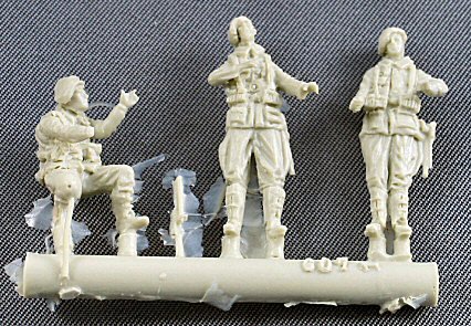 This set contains three crisply moulded figures of WW2 Belgian “Cyclistes Frontières” and one Belgian purpose build military bike. The soldiers and their uniforms look the part, except for the unit’s special headgear, an oversize royal blue beret. In reality this was almost as flat as a pancake on the side of the head. However, here they are much too round. You can see what the beret should look like here. Height of the figurines is 25mm or 1 inch which means about 1m80 or 6 feet in reality, so spot on. The bike is a delicate little kit combining a resin frame (on two sprues) with PE wheels. PE is a good solution for the wheel spokes but the tires themselves will look too flat once assembled. A concise construction sheet is included which does the job. Some resin parts have a little flash and one or two air bubbles are present, but nothing one cannot correct easily.