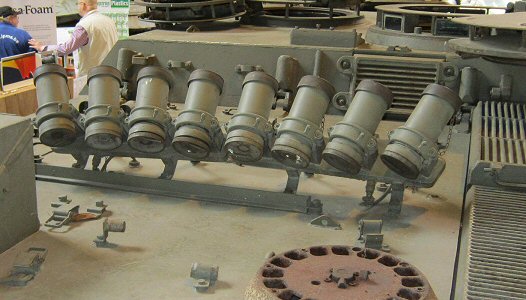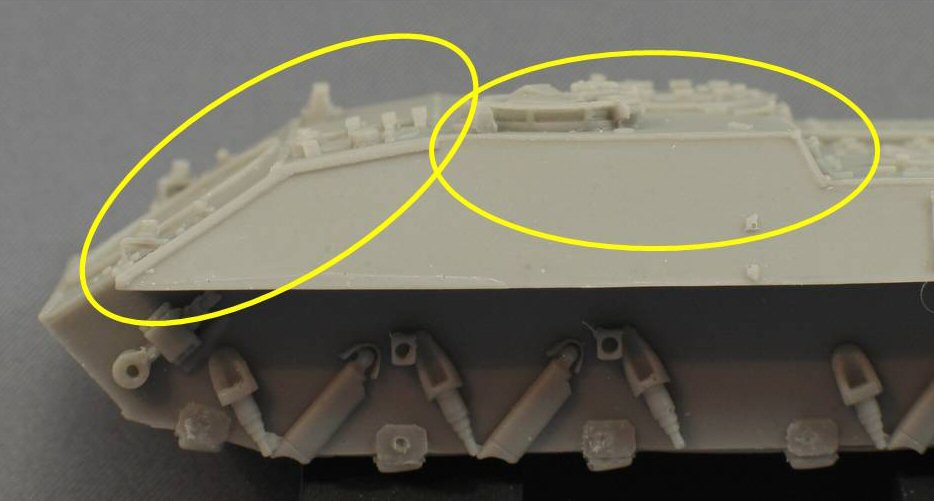 | The alignment of the two sets of four smoke grenade launchers does not look quite right. Compare the resin parts with the real stuff on the right | ||