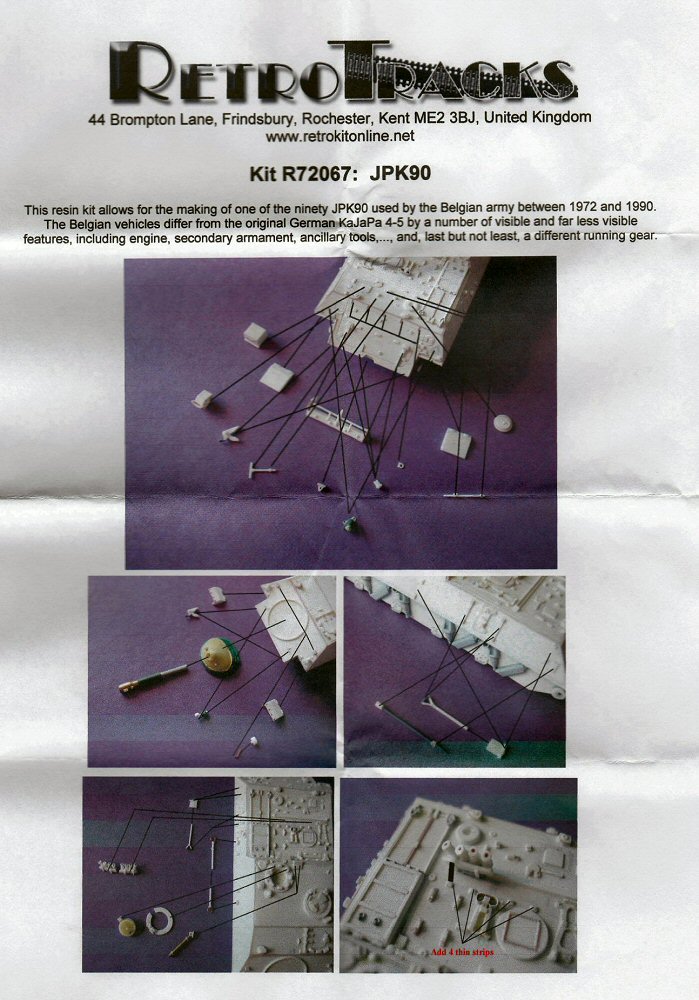 What do you get? Being the last descendant of the long family line of World War 2 Jagdpanzers, the JPK is well known for his service with the Bundeswehr during the Cold War. However, few people are aware of the fact that between 1975 and 1992, the Belgian army also used 80 vehicles. Retrotracks offers a resin kit of the Belgian version, which differs slightly from the German one. The most obvious differences are the tracks, roadwheels and suspension (which are those of the German Marder APC), the absence of a light projector (and its attachments) on the mantlet (Belgium preferred the use of two Swedish Bofors 71mm Lyran flare launchers for illuminating targets at night) and a Belgian FN MAG machinegun on the loaders hatch instead of the German MG3. |
