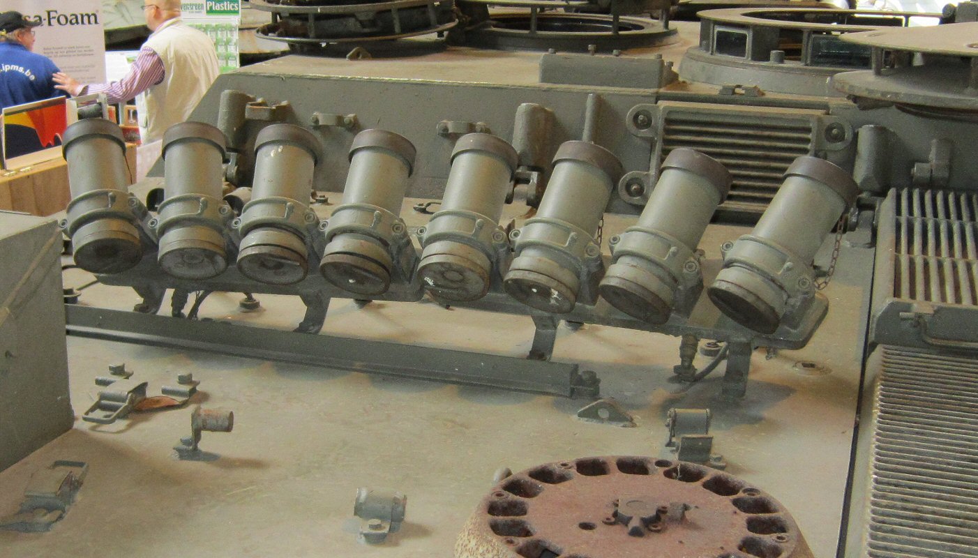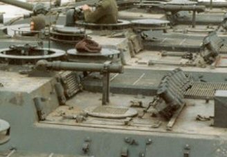 The Lyran flare launchers, next to the vehicle commander's hatch, can only be assembled in a raised 45° position, which is the usual situation during night combat. When not in use (e.g. in daytime or during long movements) they were stowed horizontally in their travel lock, pointing to the rear. Retrotracks has moulded a nice reproduction of this travel lock directly on the engine deck. Since these mortars were considered as being a weapon, they could easily be removed for safe storage in the armoury. So, when not needed (e.g. during maintenance or in the parking area) they were mostly left off. Additionally, during gunnery training, sometimes a lazy crew installed only one launcher to decrease the maintenance workload afterwards. |