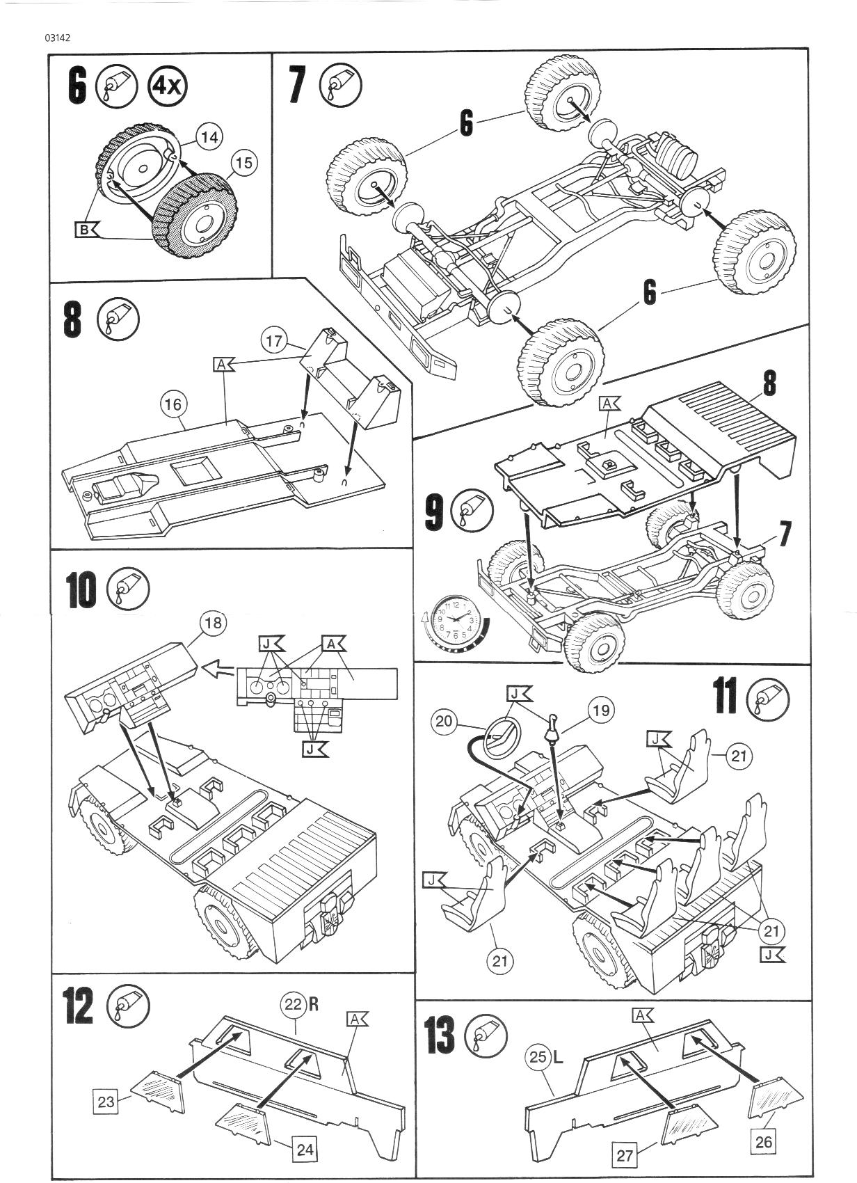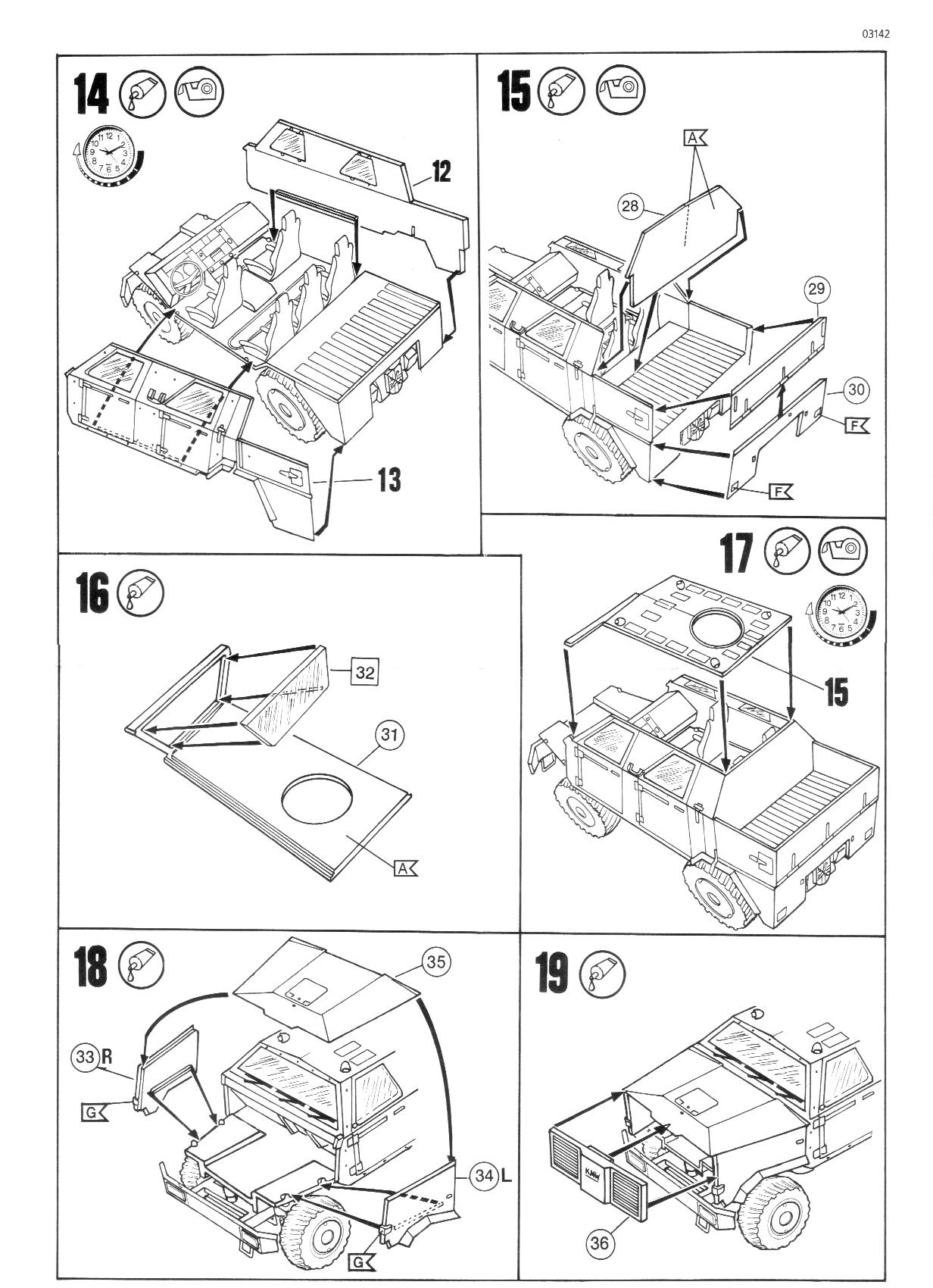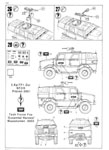 As per my usual, the kit was built pretty much straight out of the box, not modifying the kit much other than to drill out the openings in the front bumper, the exhaust outlet in the muffler and add an antenna cut from guitar wire. This kit builds up nicely. Fit is excellent though it is a bit tight in places. Pay particular attention to the mine blast shield under the body. I found this to interfere with the chassis frame which made the frame twist and skew a bit resulting in a major body slant. I rectified this with some sanding and scraping to relieve the contact point causing the problem. I was not impressed with the molding of the side windows. They all come with small tabs, which I suppose are there to help position the window into its opening, but in my mind they detract from the overall look of the windows. They also had a habit of breaking off when the window was pushed into its opening leaving a small white mar in the clear plastic. I suppose these tabs could be removed beforehand and the mars touched up with some sanding and polishing, but that seemed like more work than I willing to do. I suppose one way to reduce their presence would be to dirty up the windows a bit to try and hide them. As far as I can tell, the kit is accurate save
