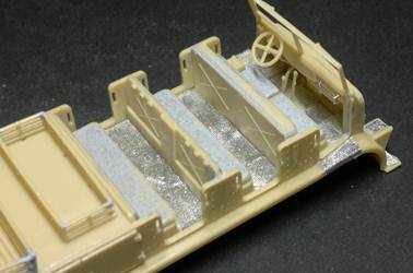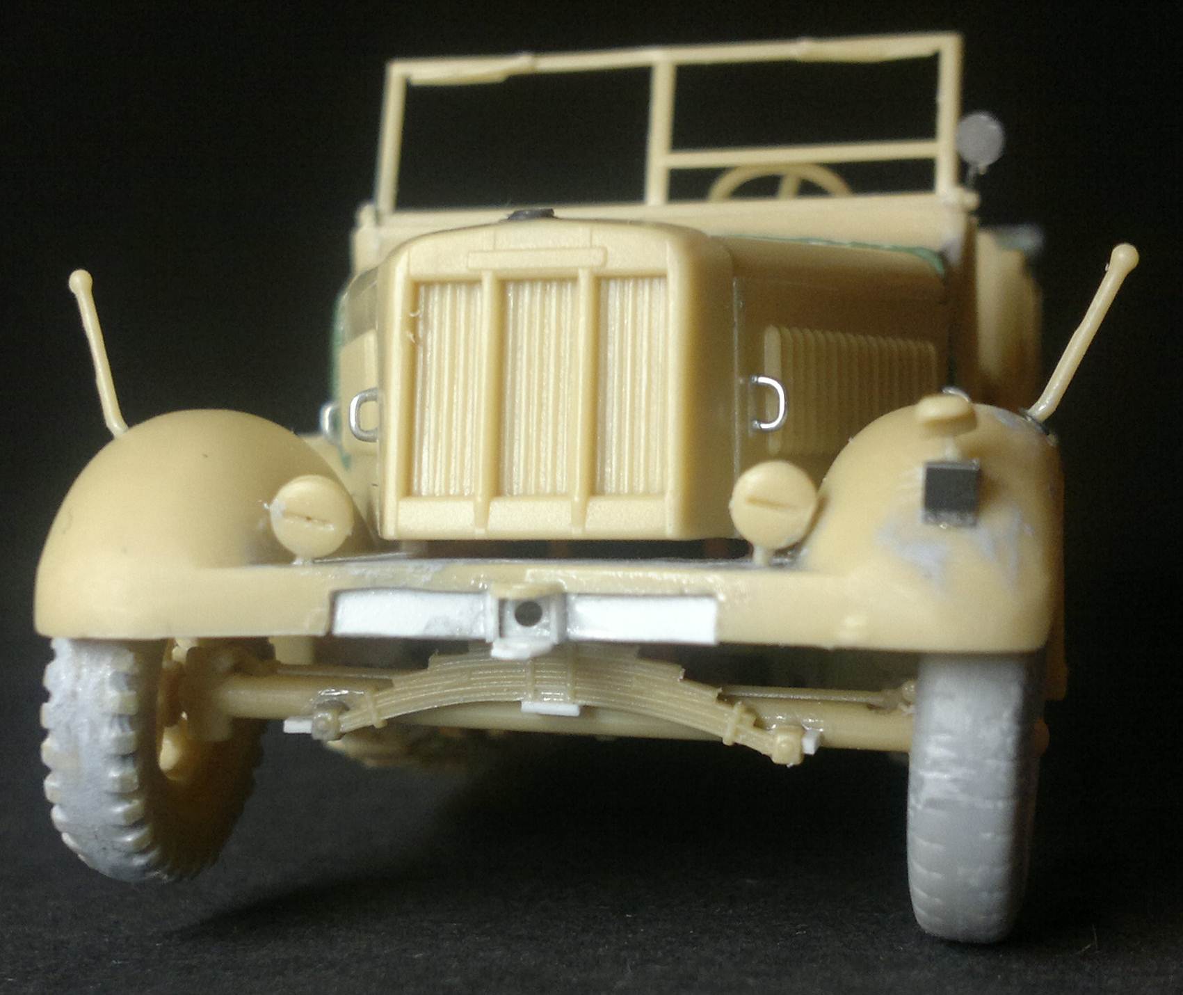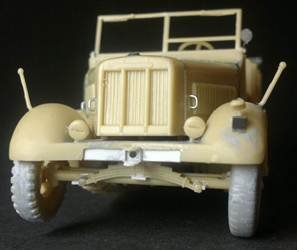 The anti-slip pattern on the fenders is lacking. To simulate it, I used paper from a pack of sigarettes. The tow cable was made from strands of metalic wire and the texture of the seats was improved with the help of some putty. The front wheels are rather toy-like, but the hubs are actualy very good, especially after thinning sown with a scalpel. There is a rather prominent gap between the driver's compartment and the hood (bonnet), which needs to be filled with putty. It will probbaly fit better if you remove the locating pegs. The front suspension is a strange construction, and doesn't capture the look of the real thing. I added some length to the leaf spring on the side of the co-driver. The battery box is not covered in the model, which would not happen in reality, unless the battery was being charged.