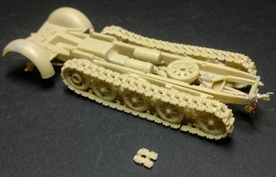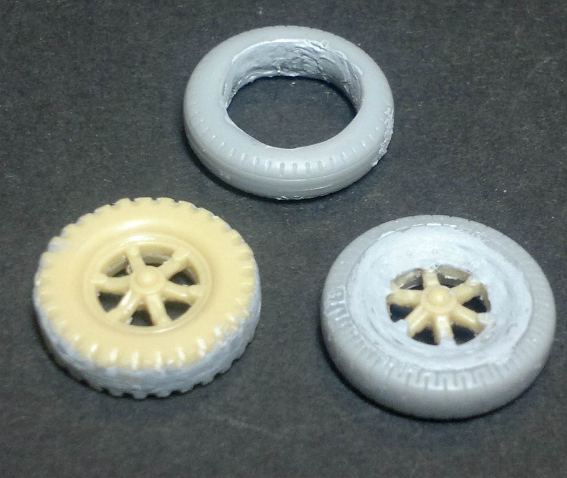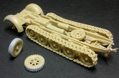 to depict a particular vehicle I have seen in a picture. On Small Scale AFV I saw a perfect Sd.Kfz. 7 from Hasegawa.The wheels from the Hasagawa Puma were used to enhance the model. I think that it looked great, but that it would be too expensive to offer up a Puma just for the wheels. On the other hand, the Hasagawa Puma has 12 wheels without rims: perfect, the Puma only needs 9. The only problem is that the Revell kit is a little too large for the Hasagawa wheels. So at the first attempt I screwed it up. The second attempt was better.