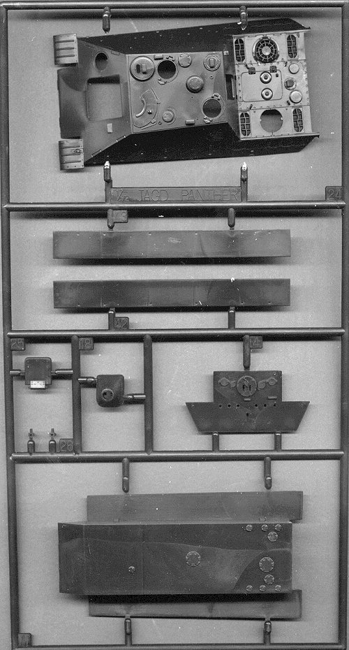 This kit includes a number of optional parts, which allow the modeler to build either the early or late versions of the Jagdpanther, or any vehicle exhibiting characteristics intermediate between the two. Some of the options include the main gun, the gun mantle, the exhaust pipes, and the engine intake vents.