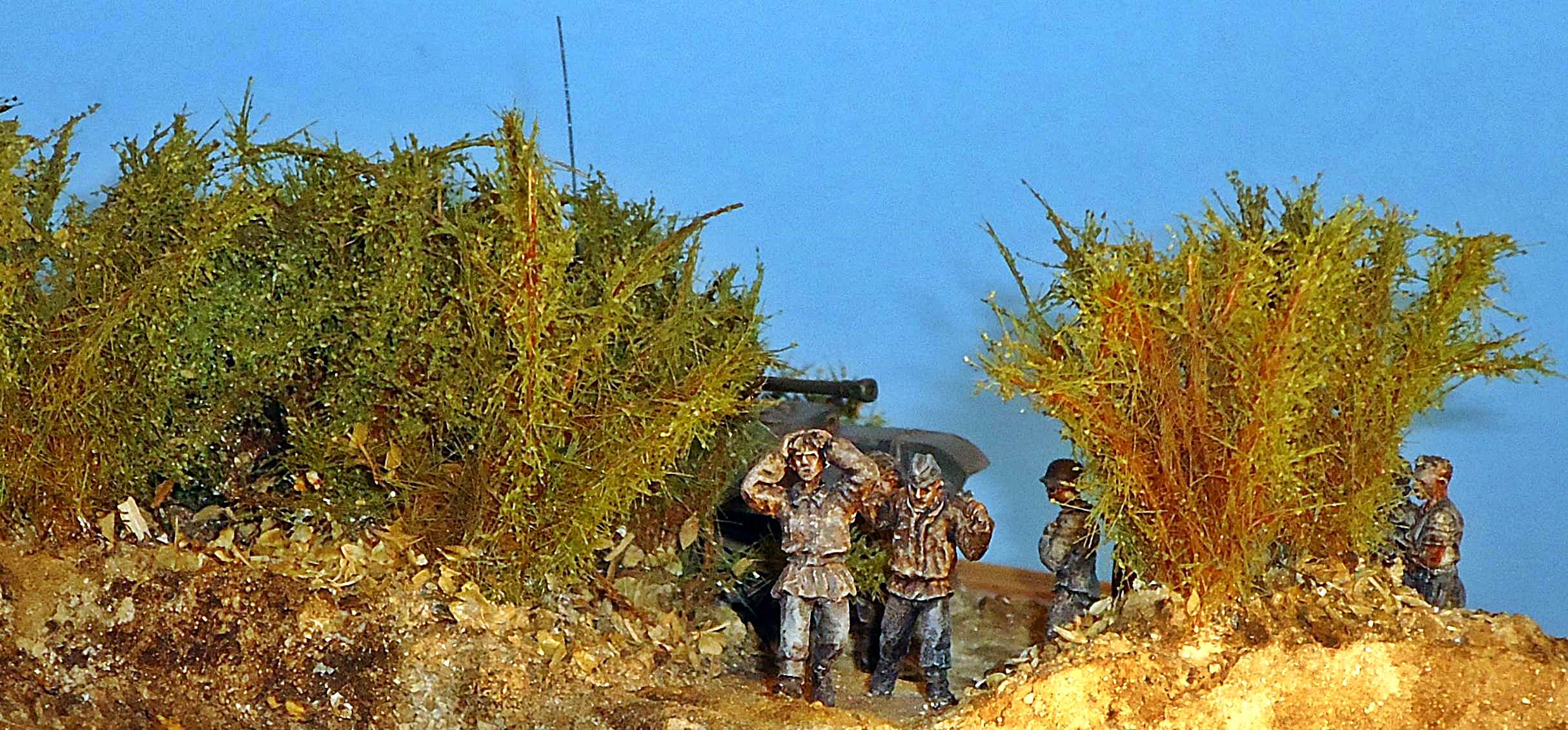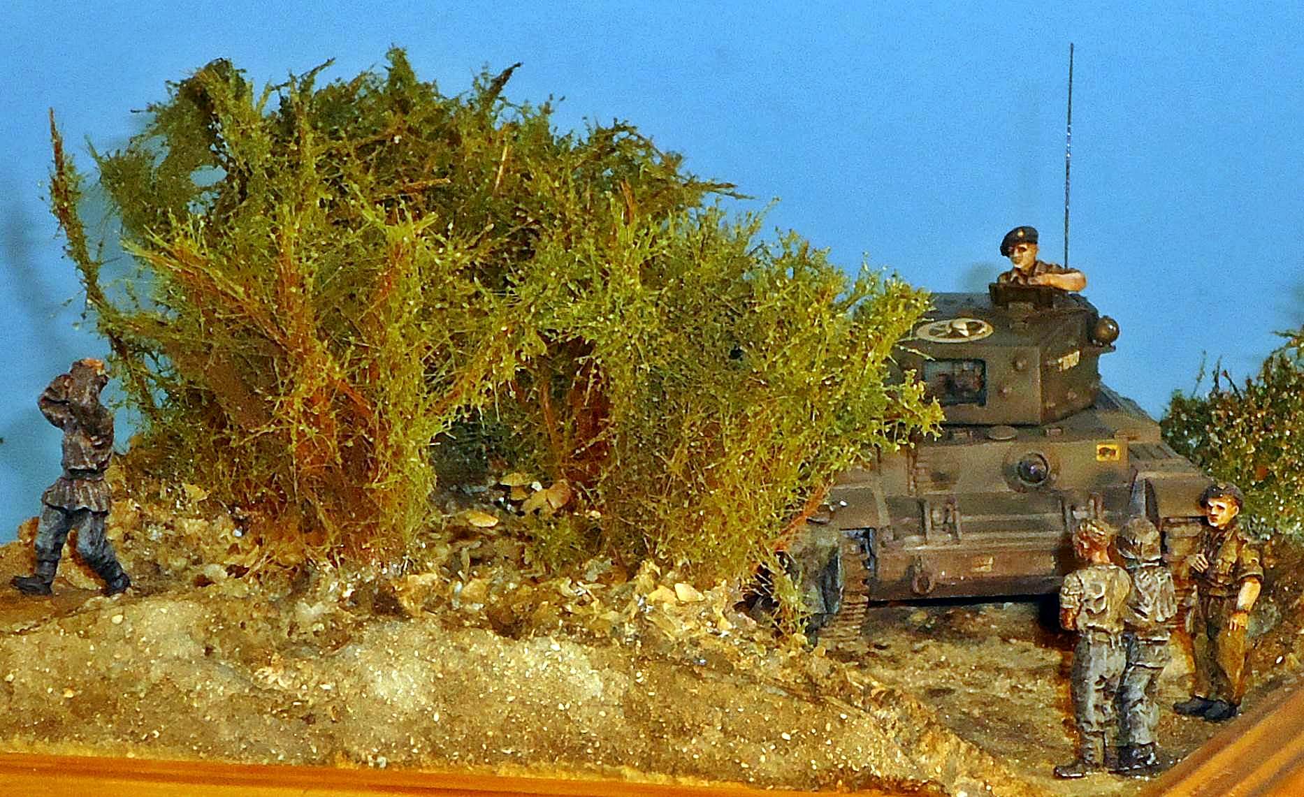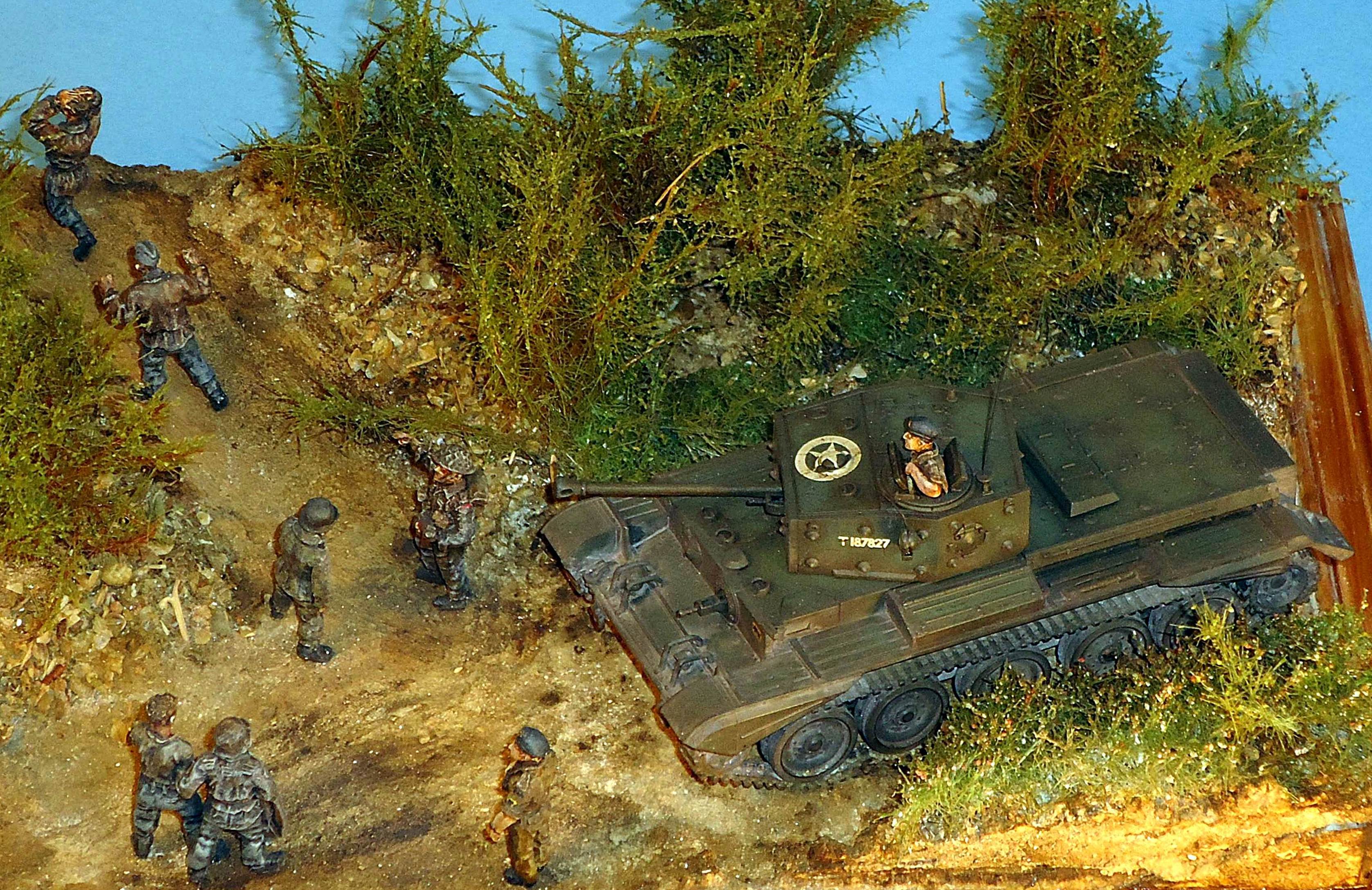 in the summer of 1944. The markings of the 7AD observation vehicle seem to be correct, though. There is however a slight misalignment in the red-over-blue square on the sheet I had at hand. The model was painted with ad hoc mixes of Vallejo paints. A black base coat was painted first over which shading with green was applied. I only hope the resulting shade comes close enough to British Olive Drab (SCC15). The diorama below was created with AB Figures (set BLA28 for the Tommy with prisoners, but for the love of any deity, I can't remember which set the tank crew came from, even though I believe they were AB too.) References [1] Le Tommy de la libération, Tome 2, J. Bouchery, Histoire & Collection (also available in English) |