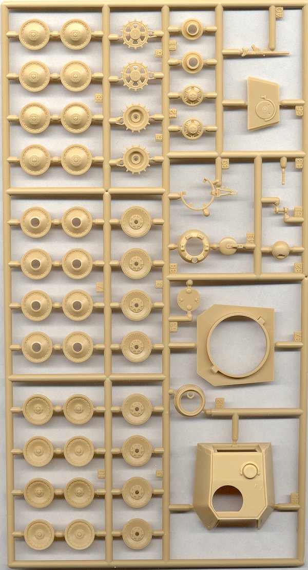 This is the first sprue, which includes the turret and wheels. The turret is a little plain compared to the ESCI turret, with a very smooth surface, and none of the small details present on the ESCI kit, such as spare track brackets for the Ausf. A, etc. Also missing are the smoke launchers, pistol ports and communication access hatch for the Ausf. D. The periscope cover for the Ausf. G is included on a later sprue. Both styles of cupola are present, for either the early or late versions of the Panther. The late style cupola is missing a periscope; there should be seven instead of six (thanks to Niko Aposalo for reminding me of this).