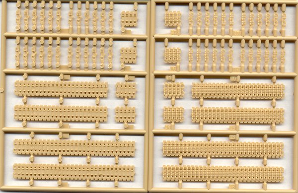 I feel that the tracks are very well done and they look very good on the completed model. But they are a bit larger than the real things, which is also reflected in the fact that the sprocket wheels thus have fewer teeth than they should. I imagine this was because of Revell's desire to not mold anything more delicate than the tracks are, but I think that molding finesse shown in their later releases have proven this to be a poor decision. (Two track sprues are shown in the scan, but only one is included in each kit.) Here is a close-up of the track detail: