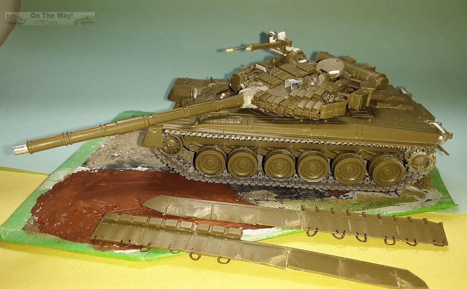 The brick-shaped ERA blocks all over the glacis and turret are a type known as Relikt-1, an early style of Soviet ERA. In this artwork the ERA bricks are angled
