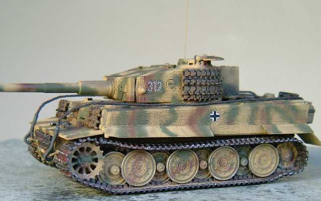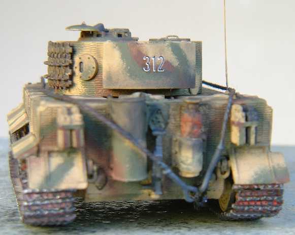 I used the kit decals that were only slightly off register and these were applied onto wet Future floor wax and allowed to dry for 24 hours before decal setting solution was applied to them. The jerry cans are Leva resin, the tank commander is a soft vinyl figure and the antenna was made with soft steel wire. Spare track was taken from my earlier Ausf. H kit and from a second Ausf. E kit I bought for spares. These were attached around the turret sides and on the hull front as applique armour. I repositioned the jack into a vertical position between the mufflers and added a shovel to hull glacis from the spares box. For the tow cables I cut the ends off of the kit supplied ones, drilled out their ends and crazy glued thick thread that had been dipped in Humbrol Gunmetal paint into the holes. This was positioned in a 'ready to tow' configuration being already attached to the front tow shackles.