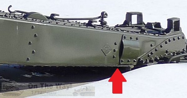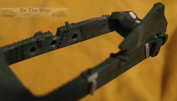 this area should be covered, based on closeups of trails found at [5]. A scratch built piece was cut from plastic sheet. Topside rivets and cross braces were mirrored