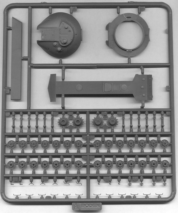 The kit is molded in a dark green plastic (the scans are gray to reduce image size), which is very similar to the plastic used by Skif. The molding quality is also quite similar. The parts are all molded very sharp, with no flash. However, my particular example suffered from a minor shift in the mold (the two mold halves were not lined up correctly) so some of the smaller parts are marred by having a slight ledge around the edges which will need to be sanded off.