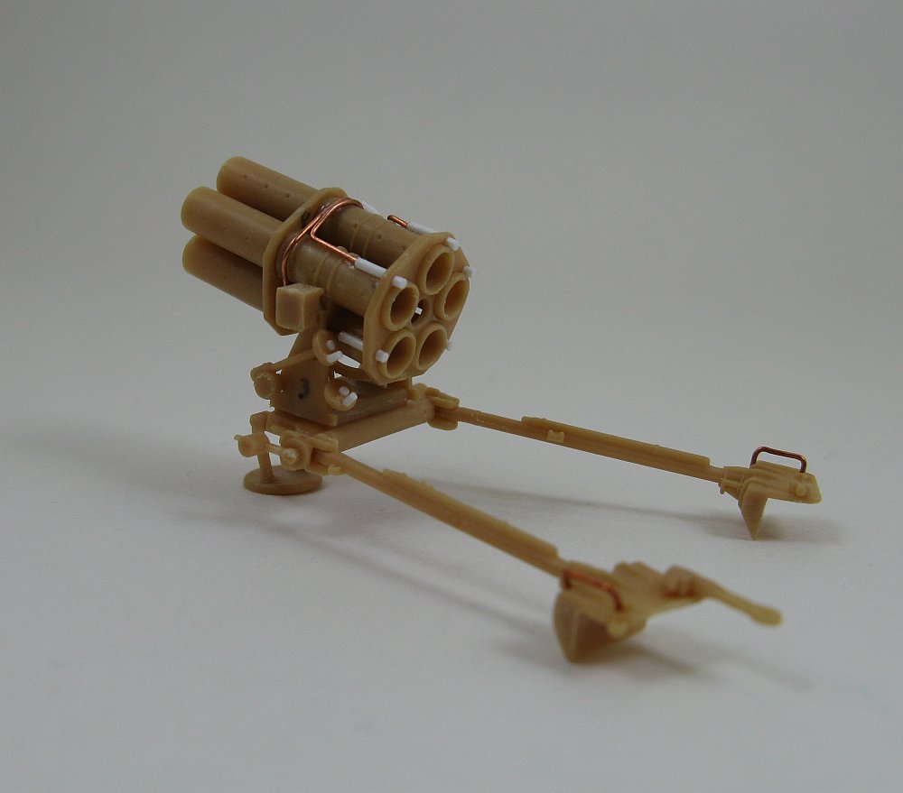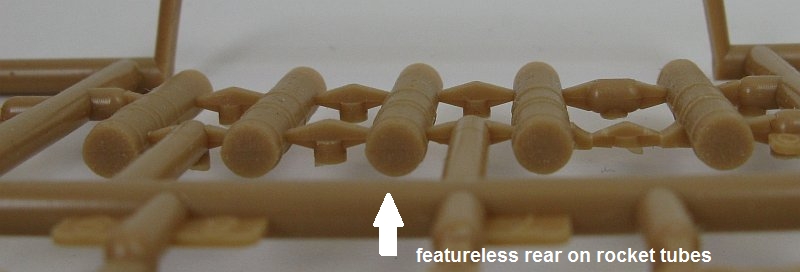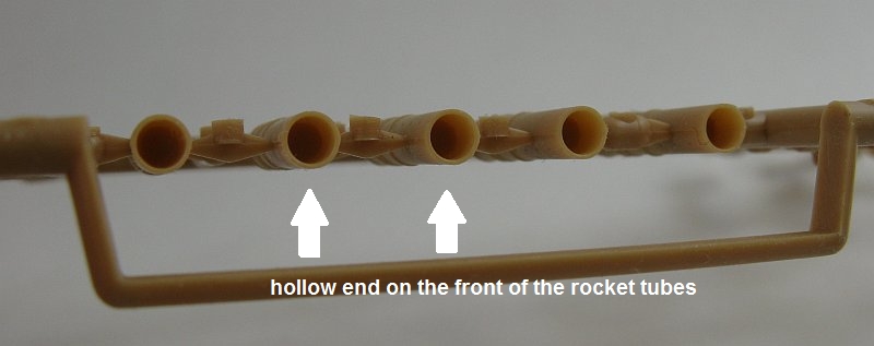 would need to cut the heads from the supplied rockets and trim them to fit into the front of the tubes and also add detail to the end of the tubes to simulate the rear end of the rockets.