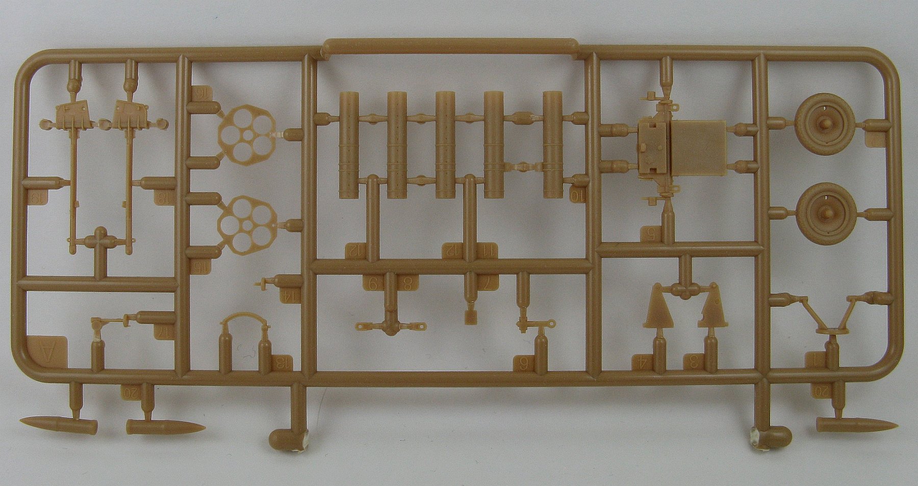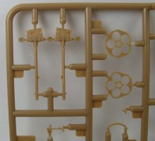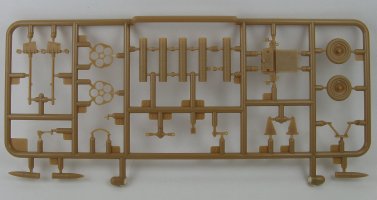 Inside the box one gets two sprues of light tan/caramel coloured hard styrene plastic parts. Each sprue has 25 parts, enough to make one complete launcher.