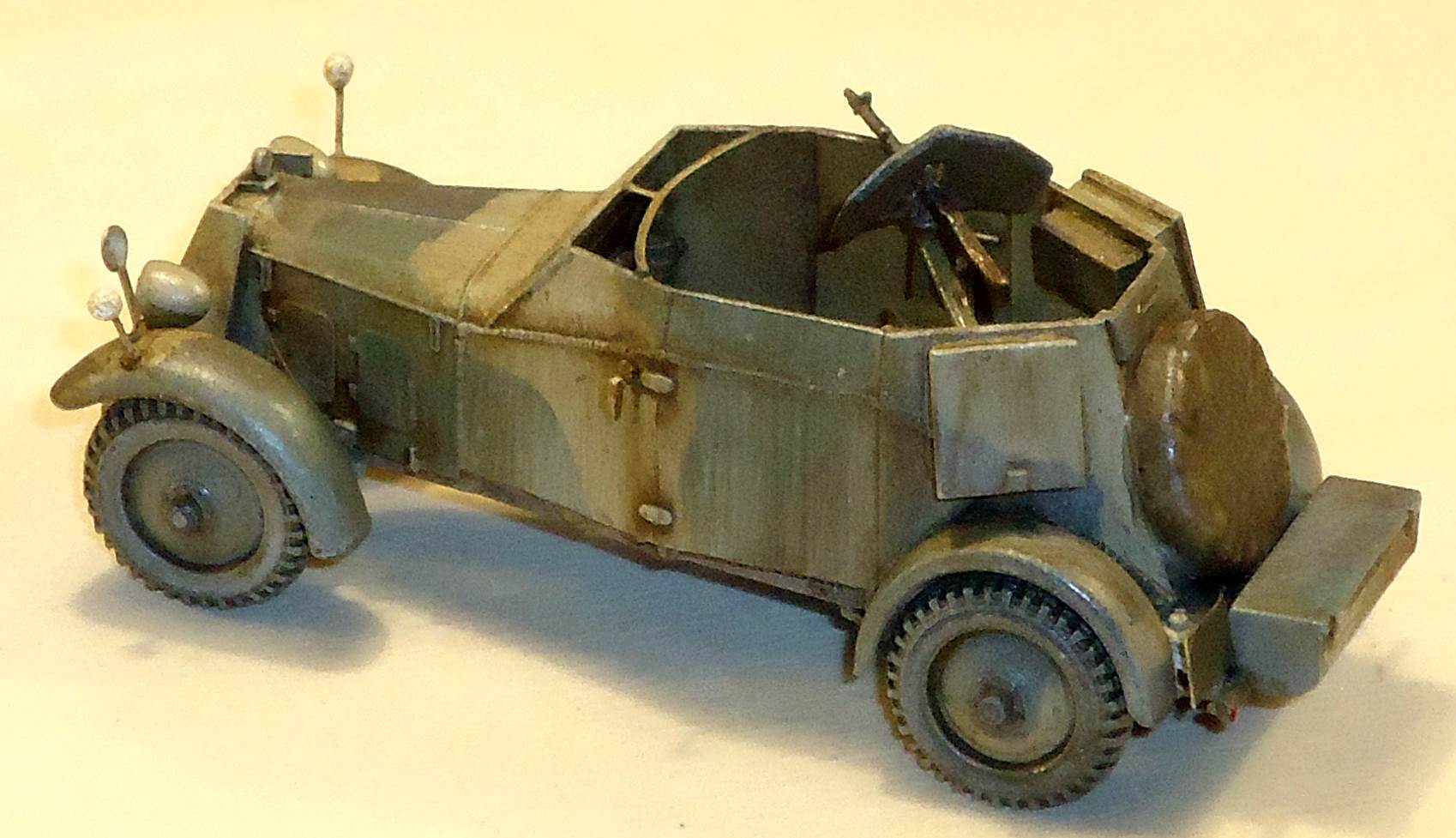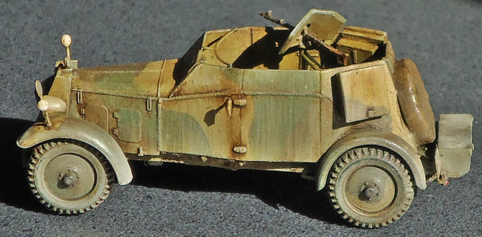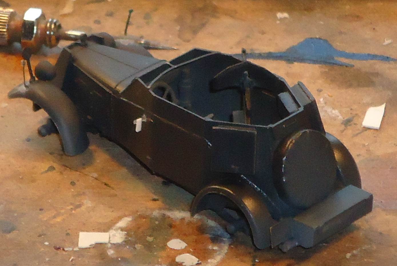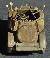 Major omissions in the kit are the boxes on the outside of the vehicle: two on the rear armor and one on the right door. (Incidentally these are also missing in the 1/48 WSW kit.) These boxes were sourced in resp. the ACE kit of the Kfz.13 and the spares box. Minor omissions are the turn indicators on the doors and the dashboard, which I made from sheet plastic and a punch-and-die set.